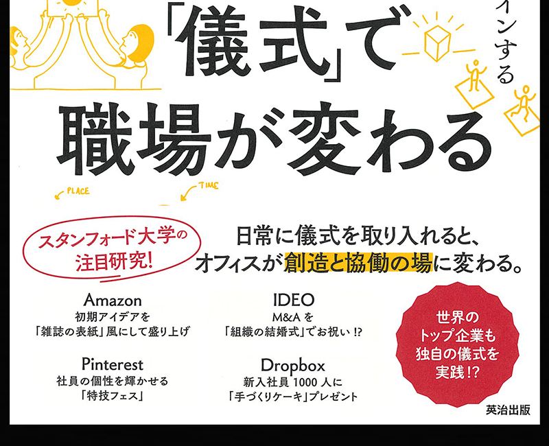 本書の帯には「スタンフォード大学の注目研究!」「日常に儀式を取り入れると、オフィスが創造と協働の場に変わる。」「Amazon 初期アイデアを『雑誌の表紙』風にして盛り上げ」「IDEO M&Aを『組織の結婚式』でお祝い!?」「Pinterest 社員の個性を輝かせる『特技フェス』」「Dropbox 新入社員1000人に『手づくりケーキ』プレゼント」「世界のトップ企業も独自の儀式を実践!?」と書かれています。