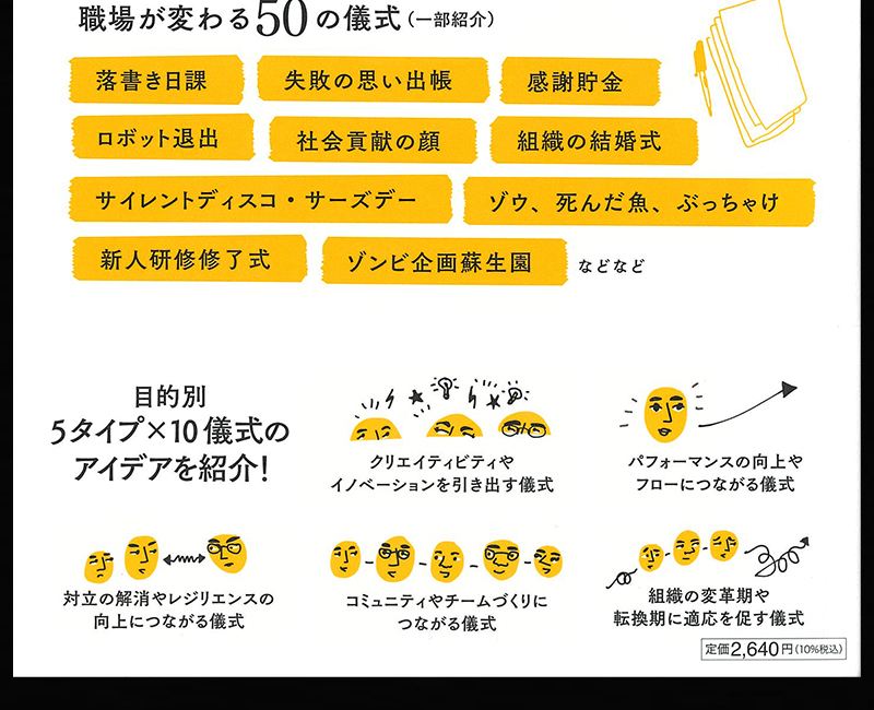 また帯の裏には「目的別 5タイプ×10儀式のアイデアを紹介!」「クリエイティビティやイノベーションを引き出す儀式」「パフォーマンスの向上やフローにつながる儀式」「対立の解消やレジリエンスの向上につながる儀式」「コミュニティやチームづくりにつながる儀式」「組織の変革期や転換期に適応を促す儀式」と書かれています。
