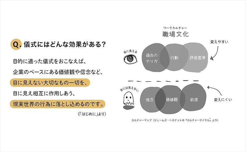 本書のカバー前そでには、「目的に適った儀式をおこえなえば、企業のベースにある価値観や信念など、目に見え相互に作用しあう、現実世界の行為に落とし込めるのです。(「はじめに」より)」と書かれています。アマゾンの内容紹介には、「より良い職場文化(ワークカルチャー)を創造するための儀式を個人・チーム・組織、シチュエーション別に提案。働き方の多様化・個別化がますます進むなかで、職場での場作りやコミュニティ形成のヒントが詰まった一冊!」とあります。