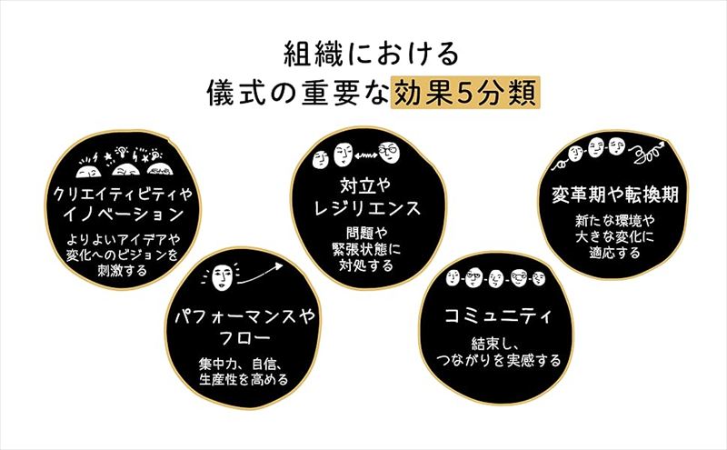 「職場が変わる儀式5タイプ」では、「儀式は仕事におけるさまざまな目的に適うが、組織において特に重要な効果を5タイプに分けた」として、「変革期や転換期:新たな環境や大きな変化に適応する」、「クリエイティビティやイノベーション:よりよいアイデアや変化へのビジョンを刺激する」、「コミュニティ:結束し、つながりと実感する」、「対立やレジリエンス:問題や緊張状態に対処する」、「パフォーマンスやフロー:集中力、自信、生産性を高める」の5タイプを示しています。