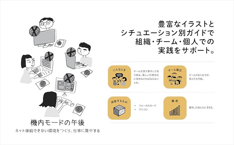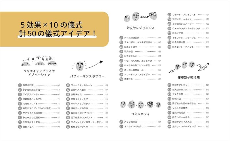 「本書の目的」の冒頭は、「本書は、日々の仕事(ワークライフ)に新しいエネルギーをもたらし、コミュニティを育むのに役立つ『儀式』を紹介するものです。とりわけ、ボトムアップで働き方を変えることに焦点を当てています。トップダウンで一丸となって取り組むというよりも、『儀式』の力を借りることで、小規模参加型で、充実感や生産性を高め、つながりを強くしようというわけです。ほかにも、チームのよりよいコミュニケーションを促す『儀式』や、組織の変革や問題に向きあう助けになる『儀式』も取り上げています」と書きだされています。