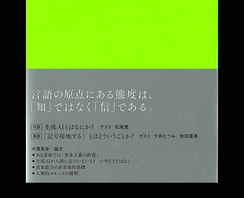 帯の裏は「言語の原点にある態度は、『知』ではなく『信』である。」として、対談「生成AIとはなにか? ゲスト:松尾豊」、鼎談「『記号接地する』とはどういうことか? ゲスト:今井むつみ、秋田喜美」と書かれ、大澤真幸論文として、「ある意味での『資本主義の終焉』」「生成 が人間に近づいている? いやそうではなく」「表象能力の非表象的基礎」「人類的コモンズの提唱」の4本の論文のタイトルが並んでいます。