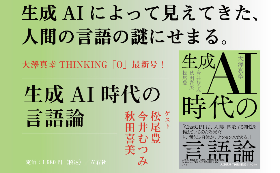 『生成AI時代の言語論』大澤真幸/今井むつみ/秋田喜美/松尾豊著(左右社)を読みました。メインの著者である大澤真幸氏は、1958年長野県松本市生まれ。東京大学大学院社会学研究科博士課程単位取得満期退学。社会学博士。千葉大学文学部助教授、京都大学大学院人間・環境学研究科教授を歴任。『ナショナリズムの由来』で毎日出版文化賞、『自由という牢獄』で河合隼雄学芸賞を受賞。著書に『不可能性の時代』『〈自由〉の条件』『社会学史』『経済の起原』『資本主義の〈その先〉へ』など多数。共著に『ふしぎなキリスト教』『おどろきの中国』『げんきな日本論』などがある。現在、個人思想誌『大澤真幸 THINKING「O」』刊行中。