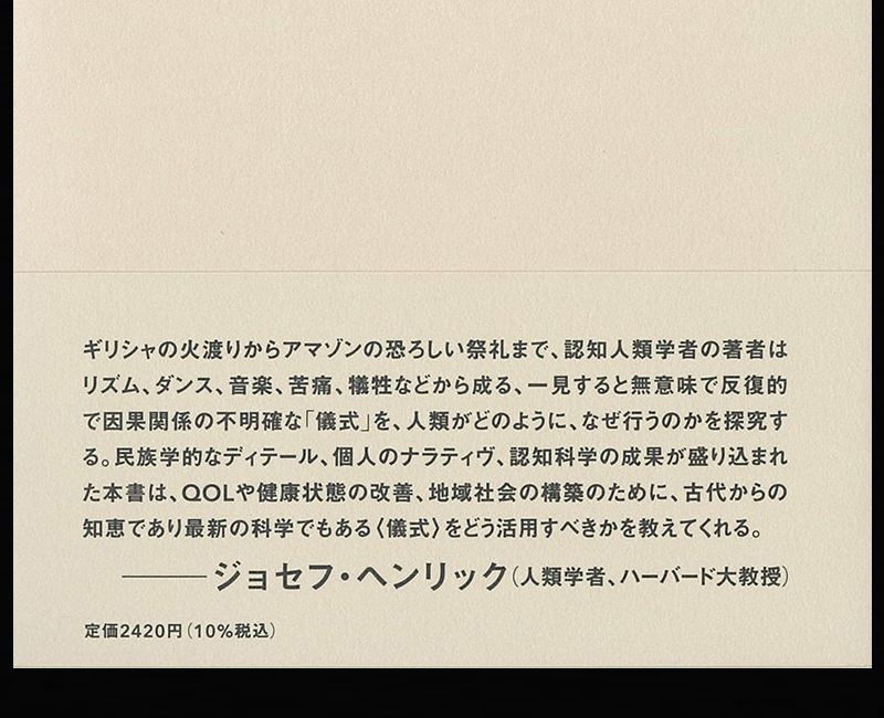 また帯の裏には、ジョセフ・ヘンリック(人類学者、ハーバード大教授)の「ギリシャの火渡りからアマゾンの恐ろしい祭礼まで、認知人類学者の著者は、リズム、ダンス、音楽、苦痛、犠牲などから成る、一見すると無意味で反復的で因果関係が不明瞭な〈儀式〉を、人類がどのように、なぜ行うのかを探求する。民族学的なデティール、個人のナラティヴ、認知科学の成果が盛り込まれた本書は、QOLや健康状態の改善、地域社会の構築のために、古代からの知恵であり最新の科学でもある〈儀式〉をどのように活用できるかを教えてくれる」という言葉が紹介されています。