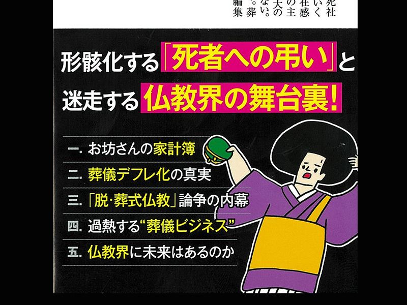 本書の帯には困っているお坊さんのイラストとともに、「葬儀のお布施 平均42万円5000円」「でも、8割のお坊さんは”“食えてない”!?」「お葬式と仏教アンダーワールド」と書かれています。また帯の裏には、空の財布を手に頭を抱えるお坊さんのイラストとともに「形骸化する『死者への弔い』と迷走する『仏教界の舞台裏!』」と書かれています。