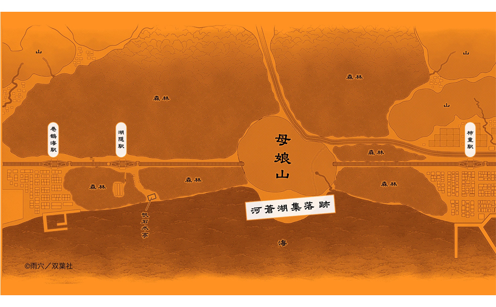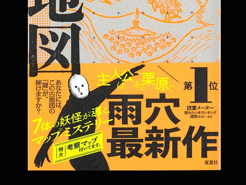 本書の帯には踊る著者のイラストとともに、「雨穴最新作」と大書されています。また、「第1位 読書メーター 読みたい本ランキング 週刊(9/16~22)」「主人公は栗原!!」「あなたには、この古地図の『謎』が、解けますか?」「7つの妖怪が導く、マップ・ミステリー」「特大考察マップ付いています。」と書かれています。