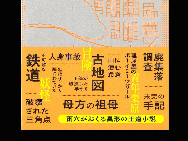 また帯の裏には、「妖怪」「冒険」「青年栗原」「不可解な鉄道」「人身事故」「私はすっかり騙されていた」「下部が破損した手すり」「古地図」「山に潜む殺意」「理屈屋のボーイミーツガール」「廃集落調査」「破壊された三角点」「母方の祖母」「未完の手記」「雨穴がおくる異形の王道小説」と書かれています。