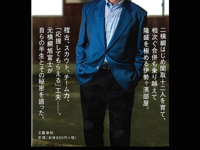 本書の帯の裏には、「二横綱はじめ関取十二人を育て、相次ぐ合併も乗り越えて隆盛を極める伊勢ヶ浜部屋。稽古、スカウト、チーム力、『応援してもらえる』工夫・・・・・・。元横綱旭富士が自らの半生とその秘密を語った」と書かれています。