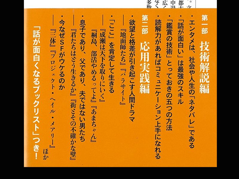 本書の前そでには、「『とっさに言葉が出てこない』『アイスブレイク的な雑談が苦手』『飲み会で昔の話ばかりする大人になりたくない』・・・・・・そんな時、話題の本や漫画、最新の映画やドラマについて魅力的に語れる人は強い。社会や人生の『ネタバレ』が詰まったエンタメは、多くの人の興味も引く。ただ、作品を読み解き、その面白さを伝えるには、実は『コツ』がある。気鋭の文芸評論家が自ら実践する『「鑑賞」の技術』を徹底解説!」と書かれています。