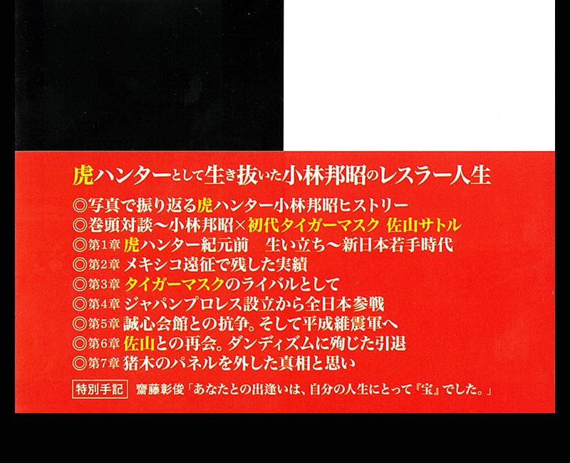 本書のカバー表紙には、初代タイガーマスクの仮面を鬼の形相で引きちぎっている小林邦昭の写真が使われ、帯には「タイガーマスク✕小林邦昭 最後のライバル対談を収録!」と書かれ、「本当のストロングスタイルをやったのは小林さんだけです 初代タイガーマスク 佐山サトル」のコメントと共に初代タイガーマスクの顔写真が掲載されています。帯の裏には、「虎ハンターとして生き抜いた小林邦昭のレスラー人生」として、本書の目次が紹介されています。