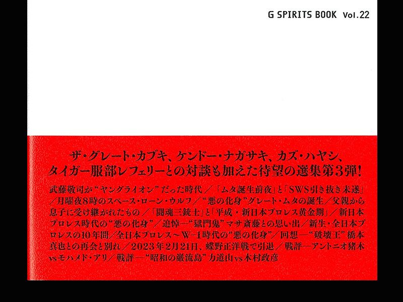 本書のカバー表紙には若き日の武藤敬司の雄姿の写真が使われ、帯には「専門誌『Gスピリッツ』に掲載されたプロレスリング・マスターの証言を一挙収録!」「『プロレスというのは、やっぱり感動がキーワードだと思うよ。人の心を動かす試合はグレート・ムタじゃなく、武藤敬司がやってるよ』」と書かれています。帯の裏には「ザ・グレート・カブキ、ケンドー・ナガサキ、カズ・ハヤシ、タイガー服部レフェリーとの対談も加えた待望のアンソロジーシリーズ第3弾!」と書かれ、本書の内容が紹介されています。