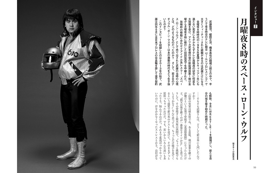インタビュー2「月曜夜8時のスペース・ローン・ウルフ」では、1987年10月24日に公開された東宝映画「光る女」(監督=相米信二)で、武藤が堂々の主演を果たしたことが取り上げられます。インタビュアーの小佐野景浩氏の「映画『光る女』で主演を張ったのは今になって振り返っても異例中の異例ですよね」という発言に対して、武藤は「主人公がデカイという設定だったから監督が相撲とかバスケットボールとかいろんな世界に探しに行って、プロレス界でも何人か見たみたいで。それで俺に白羽の矢が立ったんだよ。あとは会社間の話し合いだけど、シリーズに穴を開けるわけだから、いいギャラを取りましたよ」